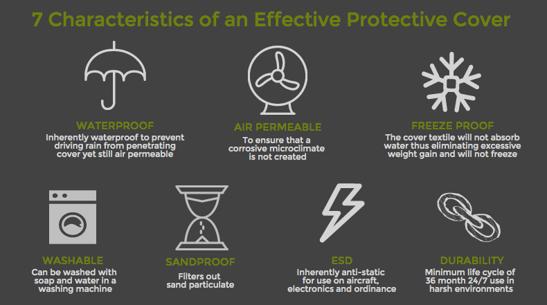 Protective Covers. Almost all vehicles that have turrets leak have the following issues: internal mold and corrosion, coating system deterioration due to UV and abrasion, equipment electronic failure from corrosion and excessive heat damage during storage, airborne particulates which cause corrosion and sand damage to windscreens. Protective covers are having a dramatic effect in reducing corrosion from UV, sand, moisture and airborne pollutants. To be effective a cover needs, at a minimum, to be extremely air permeable to naturally offload moisture and heat. The US Army is having success using special corrosion-reducing covers. An effective protective cover, employed correctly, will significantly improve readiness, reduce maintenance and extend life cycle. “Corrosion remains the largest preventable cost to the U.S. military, a cost which exceeds $23.0 billion per year.” Heat, dust, UV rays and moisture degrade military hardware, leading to decreased readiness, increased manpower requirements and significantly higher long-term costs.