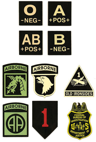 Warrior GloTape Infrared (IR) Reflective Blood Type Markers and Custom IR Markers provide visual and covert IR combat identification in one cost effective package. These markers are manufactured from specially-formulated material that only reflects infrared (IR) wavelengths when illuminated by light sources such as targeting lasers for covert marking of troops. When viewed with military night vision IR systems, the reflected IR light provides a simple marking method that identifies friendly persons to team members at distances up to 800 meters. To the naked eye, GloTape appears to be similar to black duct tape in both texture and finish. Available with Velcro hook, or peal-and-stick backing.