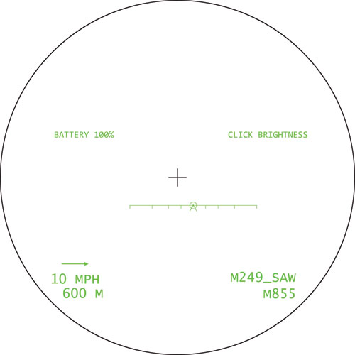 The CCAS replaces the necessity for advanced marksmanship skills such as range estimation, windage adjustment and angle of fire adjustment. The reticle display is a green graphic overlay providing a “corrected reticle” for both stationary and moving targets to the shooter, speeding up target engagement while increasing first round affects on target. Range a target with the black crosshair to produce horizontal holdover bar with aiming points. Then use the circle to aim at stationary targets, and the chevron to track and aim at moving targets. The shooter selectable menu options range from weapon/ammo type, wind speed input, range to target